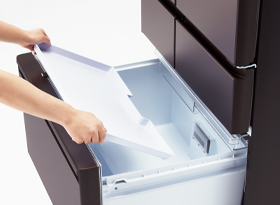 たっぷりの容量を奥行きで実現しました。開け閉めスムーズだから、奥の大物野菜も出し入れラクラクです。野菜室が真ん中なので、食品の出し入れがしやすく、調理中も小物野菜などがサッと取り出せて便利です。また、上下2段ケースの区分けで形や大きさがバラバラの野菜を、見やすくスッキリ収納できて便利。
